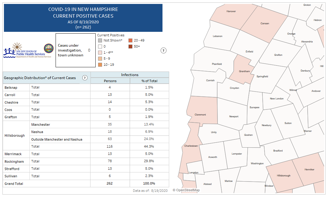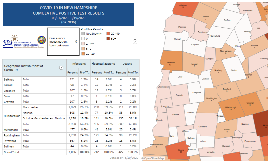 On Wednesday, August 19, 2020, DHHS announced 19 new positive test results for COVID-19. There have now been 7,036 cases of COVID-19 diagnosed in New Hampshire. Several cases are still under investigation. Additional information from ongoing investigations will be incorporated into future COVID-19 updates. Of those with complete information, there is one individual under the age of 18 and the rest are adults, with 47% being female and 53% being male. The new cases reside in Rockingham (5), Hillsborough County other than Manchester and Nashua (4), and Merrimack (2) counties, and in the cities of Manchester (6) and Nashua (2).