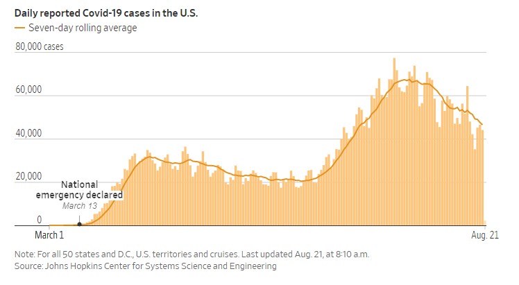 “The U.S. reported fewer than 50,000 new coronavirus cases for the sixth day in a row, as some states and universities took further steps to try to control the pandemic.