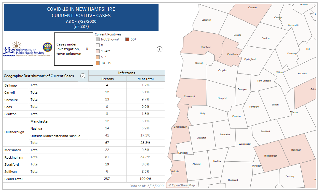 On Tuesday, August 25, 2020, DHHS announced 16 new positive test results for COVID-19. There have now been 7,150 cases of COVID-19 diagnosed in New Hampshire. Several cases are still under investigation. Additional information from ongoing investigations will be incorporated into future COVID-19 updates. Of those with complete information, there are three individuals under the age of 18 and the rest are adults with 31% being female and 69% being male. The new cases reside in Rockingham (4), Cheshire (2), Hillsborough County other than Manchester and Nashua (2), Strafford (2), Sullivan (2), Merrimack (1), and Carroll (1) counties, and in the city of Nashua (2).