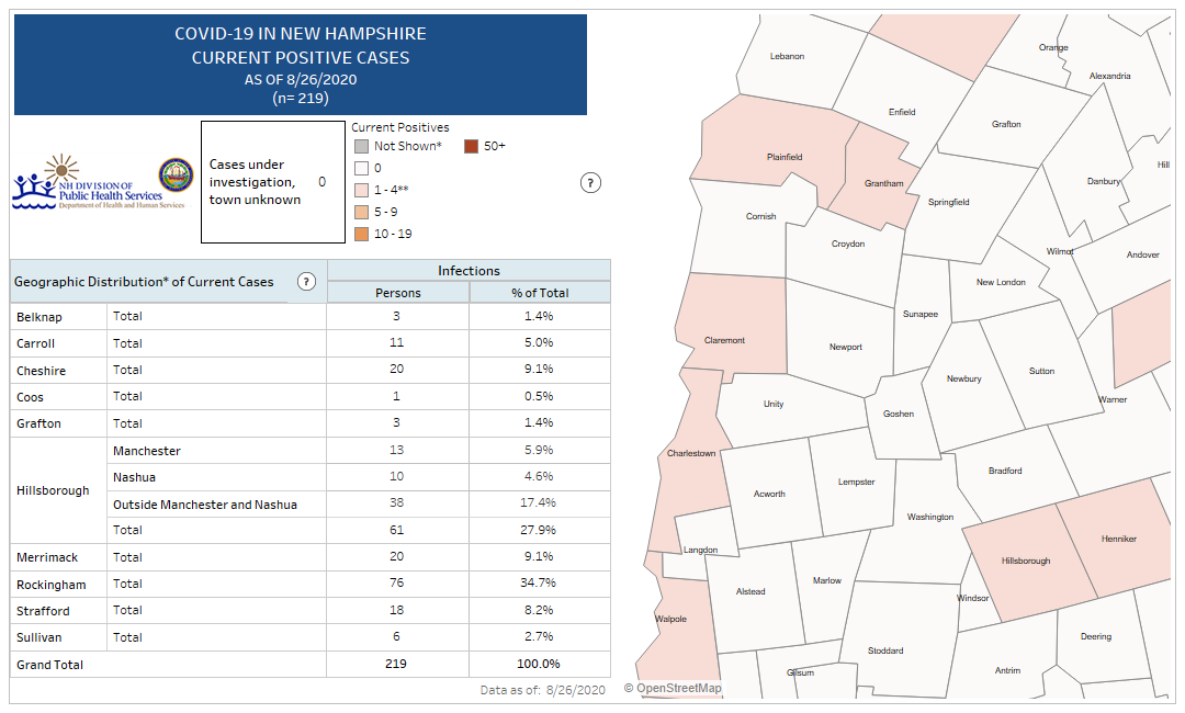 On Wednesday, August 26, 2020, DHHS announced 8 new positive test results for COVID-19. There have now been 7,159 cases of COVID-19 diagnosed in New Hampshire. Several cases are still under investigation. Additional information from ongoing investigations will be incorporated into future COVID-19 updates. Of those with complete information, there is one individual under the age of 18 and the rest are adults with 88% being female and 12% being male. The new cases reside in Hillsborough County other than Manchester and Nashua (3), Coos (1), and Rockingham (1) counties, and in the cities of Manchester (2) and Nashua (1).