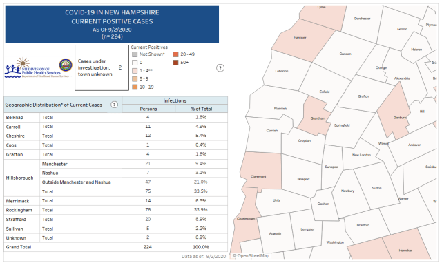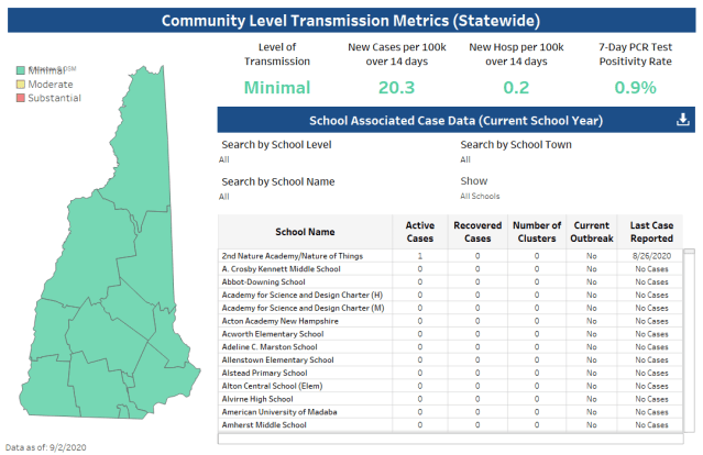 COVID-19 schools dashboard is now live. This centralized website lists every school across NH with information on the number of cases within the schools, if there are clusters of illness, and if the school has reached an outbreak status. It allows you to search by school name, town, etc. View here: