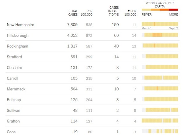 At least 12 new cases were reported in New Hampshire on Sept. 2. Over the past week, there have been an average of 21 cases per day, about the same as the average two weeks earlier.