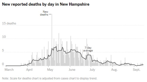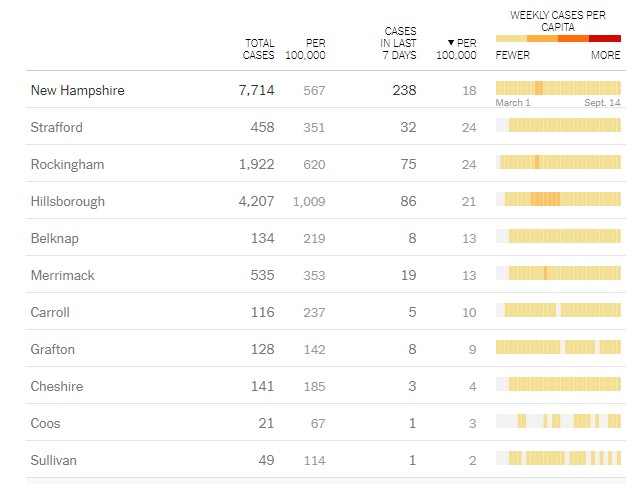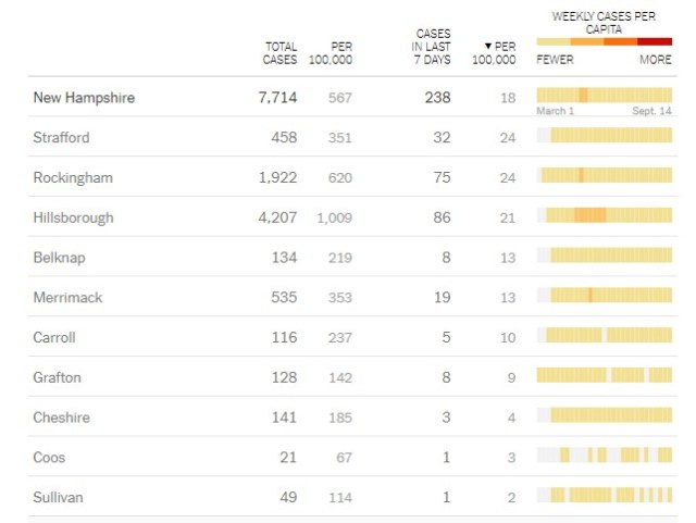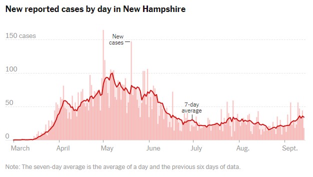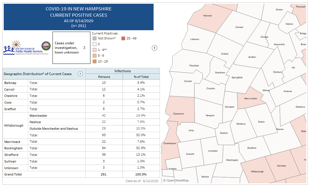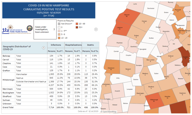 On Monday, September 14, 2020, DHHS announced 18 new positive test results for COVID-19. There have now been 7,714 cases of COVID-19 diagnosed in New Hampshire. Several cases are still under investigation.