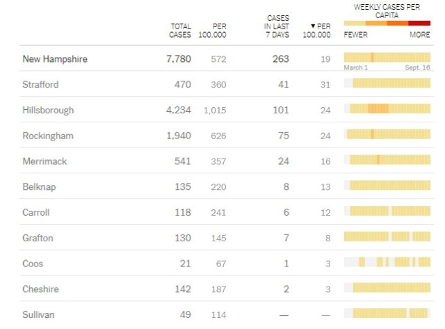 On Wednesday, September 16, 2020, DHHS announced 33 new positive test results for COVID-19. There have now been 7,780 cases of COVID-19 diagnosed in New Hampshire. Several cases are still under investigation. Additional information from ongoing investigations will be incorporated into future COVID-19 updates. Of those with complete information, there are four individuals under the age of 18 and the rest are adults with 24% being female and 76% being male. The new cases reside in Rockingham (9), Strafford (6), Hillsborough County other than Manchester and Nashua (4), Carroll (1), Grafton (1), and Merrimack (1) counties, and in the cities of Nashua (6) and Manchester (5).