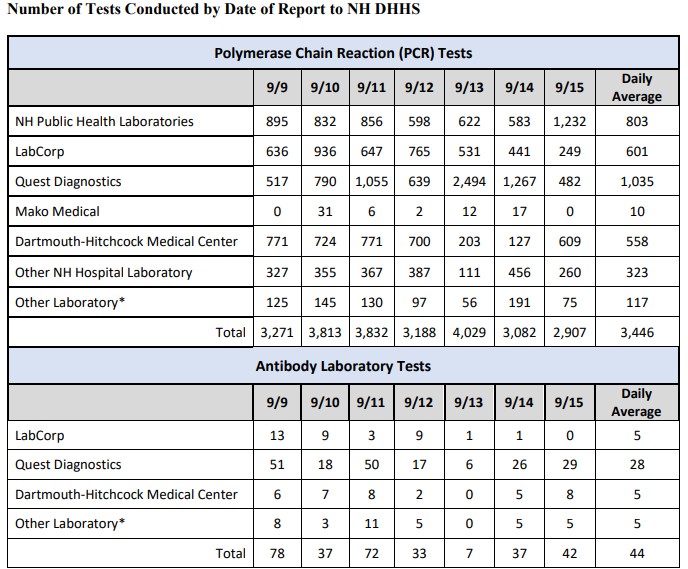 2 Includes specimens tested at the NH Public Health Laboratories (PHL), LabCorp, Quest, Dartmouth-Hitchcock Medical Center, and those sent to CDC prior to NH PHL testing capacity.