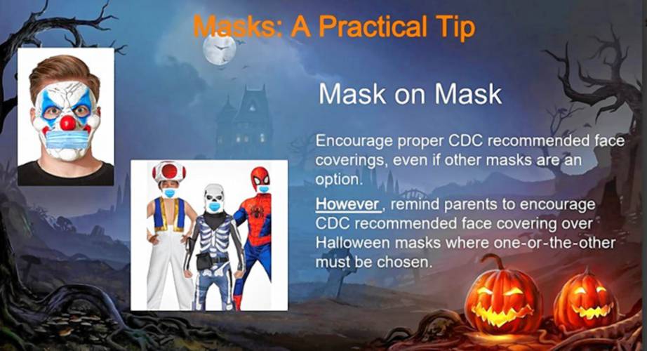 Halloween costume masks won’t protect you from airborne coronavirus; wear a cloth mask for that.