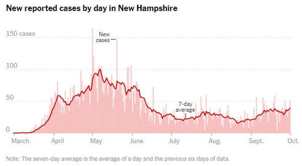 On Thursday, October 1, 2020, DHHS announced 52 new positive test results for COVID- 19. There have now been 8,317 cases of COVID-19 diagnosed in New Hampshire. Several cases are still under investigation. Additional information from ongoing investigations will be incorporated into future COVID-19 updates.
