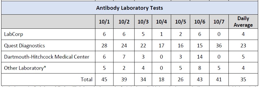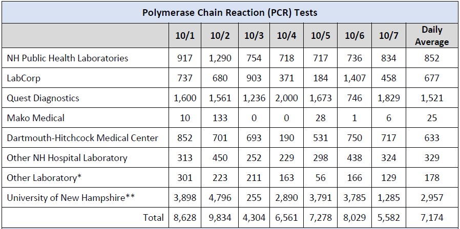 2 Includes specimens tested at the NH Public Health Laboratories (PHL), LabCorp, Quest, Dartmouth-Hitchcock Medical Center, Mako, certain hospital laboratories, the University of New Hampshire and their contracted laboratory, and those sent to CDC prior to NH PHL testing capacity.