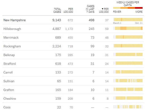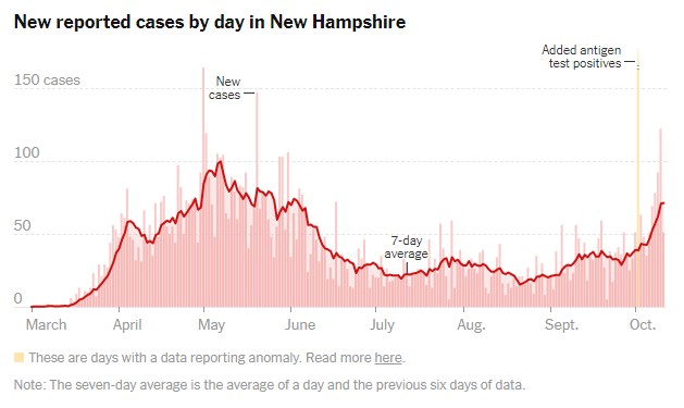 On Sunday, October 11, 2020, DHHS announced 55 new positive test results for COVID-19, for a daily PCR test positivity rate of 0.8%. Today’s results include 32 people who tested positive by PCR test and 23 who tested positive by antigen test. There are now 685 current COVID-19 cases diagnosed in New Hampshire.