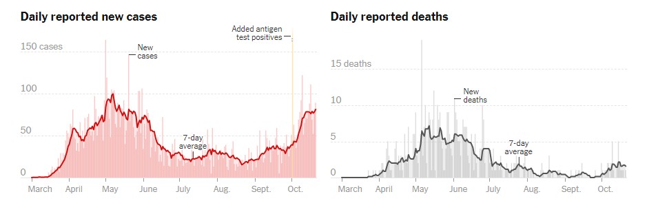 On Wednesday, October 21, 2020, DHHS announced 92 new positive test results for COVID-19, for a daily PCR test positivity rate of 1.2%. Today’s results include 52 people who tested positive by PCR test and 40 who tested positive by antigen test. There are now 798 current COVID-19 cases diagnosed in New Hampshire.