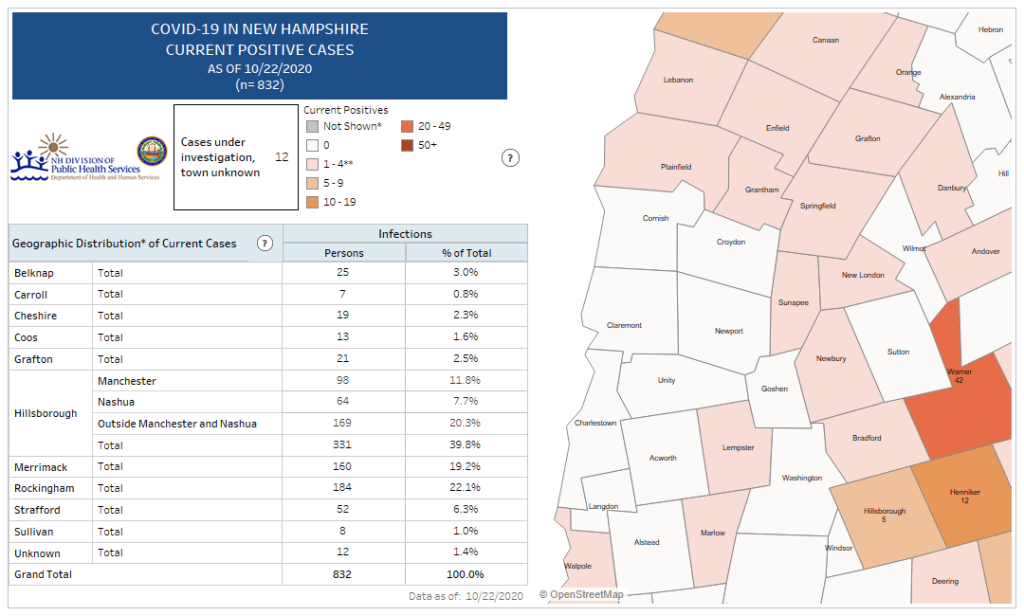 On Thursday, October 22, 2020, DHHS announced 82 new positive test results for COVID-19, for a daily PCR test positivity rate of 0.8%. Today’s results include 58 people who tested positive by PCR test and 24 who tested positive by antigen test. There are now 832 current COVID-19 cases diagnosed in New Hampshire.