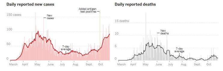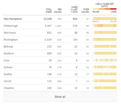 “In some ways, late October is looking alarmingly like late April when it comes to COVID-19 in New Hampshire. The number of new cases each day is rising just as fast now as it did then and will probably go higher than it ever did in the spring, although that’s partly due to increased amounts of testing.” More at https://www.concordmonitor.com/covid-coronavirus-nh-new-hampshire-36936311