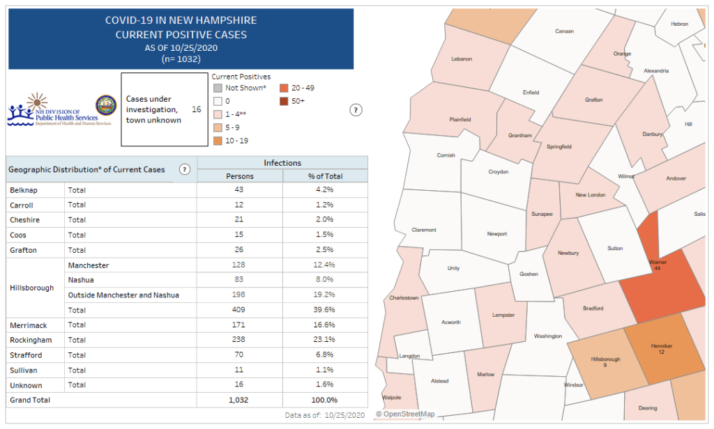 On Sunday, October 25, 2020, DHHS announced 92 new positive test results for COVID-19, for a daily PCR test positivity rate of 0.8%. Today’s results include 69 people who tested positive by PCR test and 23 who tested positive by antigen test. There are now 1,032 current COVID-19 cases diagnosed in New Hampshire.