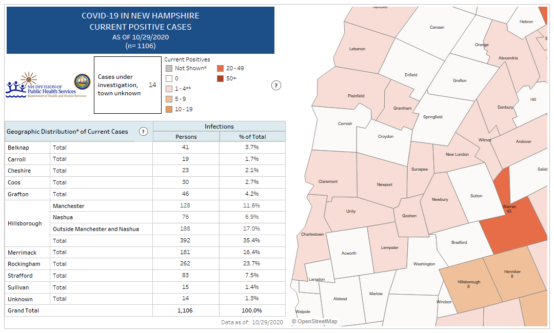 On Thursday, October 29, 2020, DHHS announced 131 new positive test results for COVID-19, for a daily PCR test positivity rate of 1.1%. Today’s results include 103 people who tested positive by PCR test and 28 who tested positive by antigen test. There are now 1,106 current COVID-19 cases diagnosed in New Hampshire.