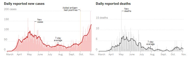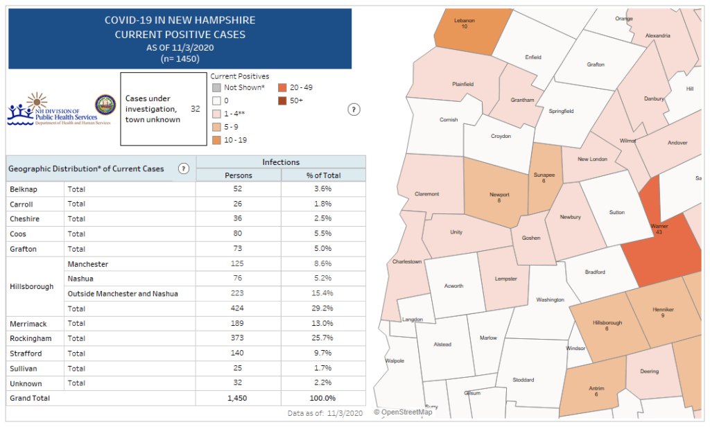 On Tuesday, November 3, 2020, DHHS announced 132 new positive test results for COVID-19, for a daily PCR test positivity rate of 1.2%. Today’s results include 73 people who tested positive by PCR test and 59 who tested positive by antigen test. There are now 1,450 current COVID-19 cases diagnosed in New Hampshire.