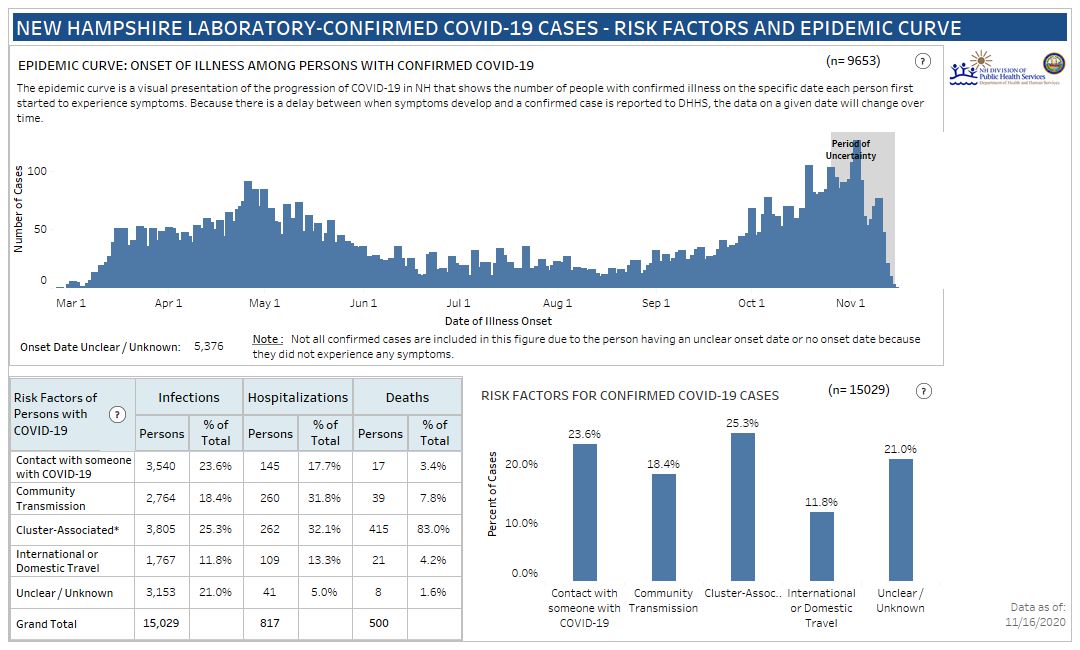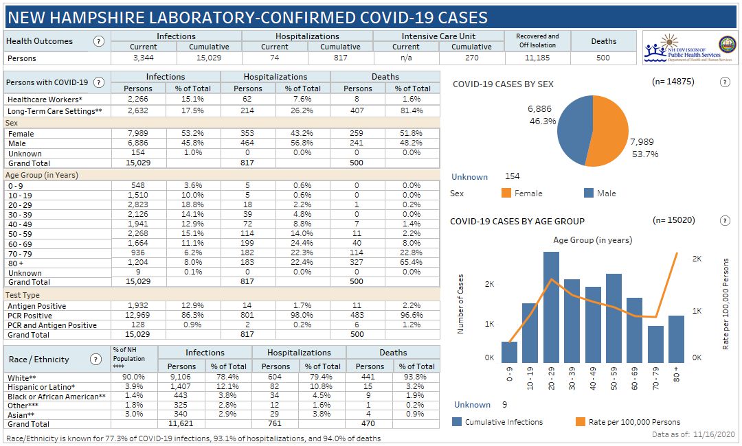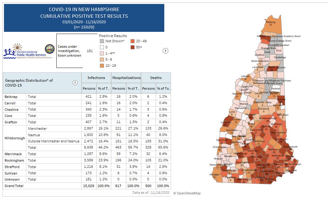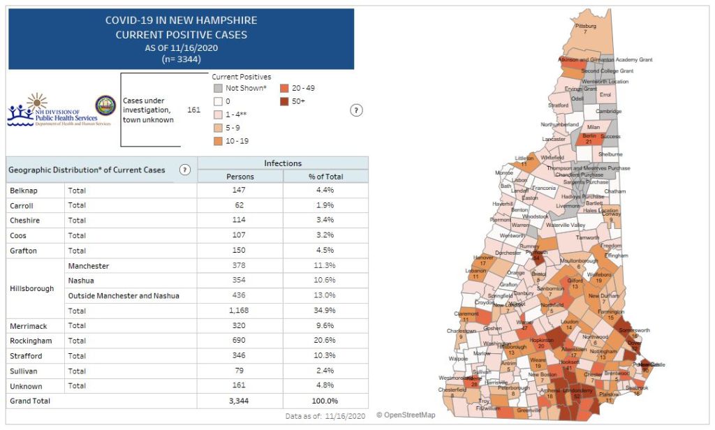 On Sunday, November 15, 2020, DHHS announced 361 new positive test results for COVID-19, for a daily PCR test positivity rate of 2.2%. Today’s results include 241 people who tested positive by PCR test and 120 who tested positive by antigen test. There are now 3,306 current COVID-19 cases diagnosed in New Hampshire.