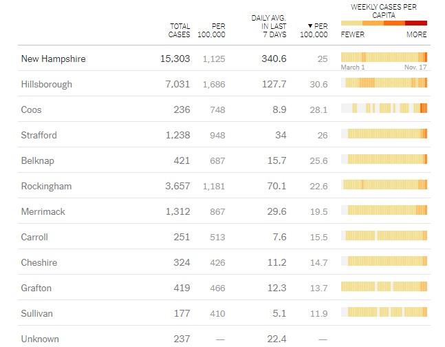 And the governor said he was focused on the side effects seen the last time around – “the mental health issues, the isolation, the shutdown of schools, the issues around abuse of kids, the issues around substance misuse and abuse.” More at https://www.concordmonitor.com/Sununu-holding-off-on-restoring-New-Hampshire-COVID-restrictions-as-cases-rise-37300180