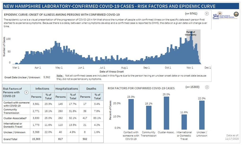 On Tuesday, November 17, 2020, DHHS announced 279 new positive test results for COVID-19, for a daily PCR test positivity rate of 2.0%. Today’s results include 198 people who tested positive by PCR test and 81 who tested positive by antigen test. There are now 3,551 current COVID-19 cases diagnosed in New Hampshire.