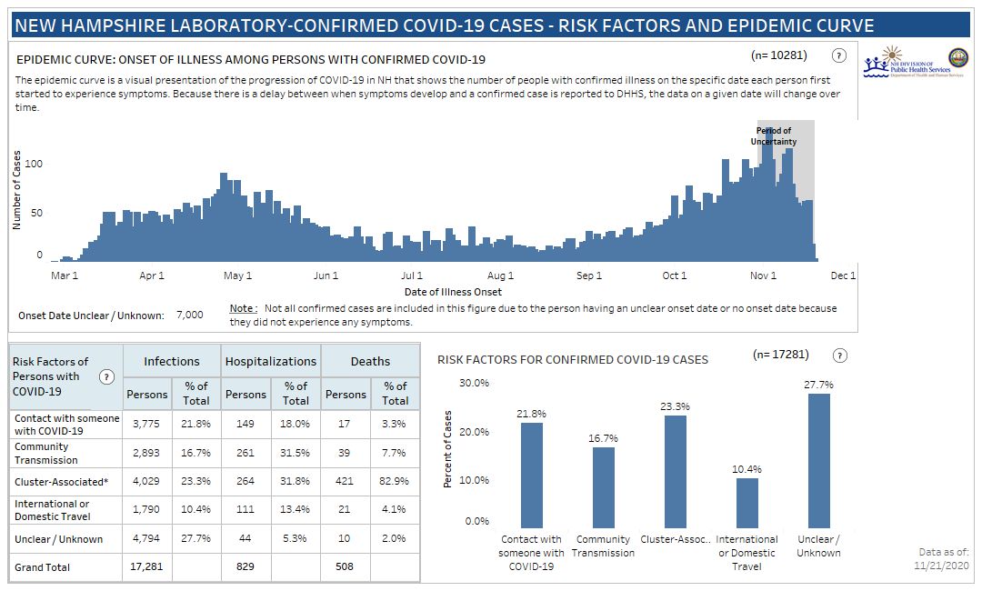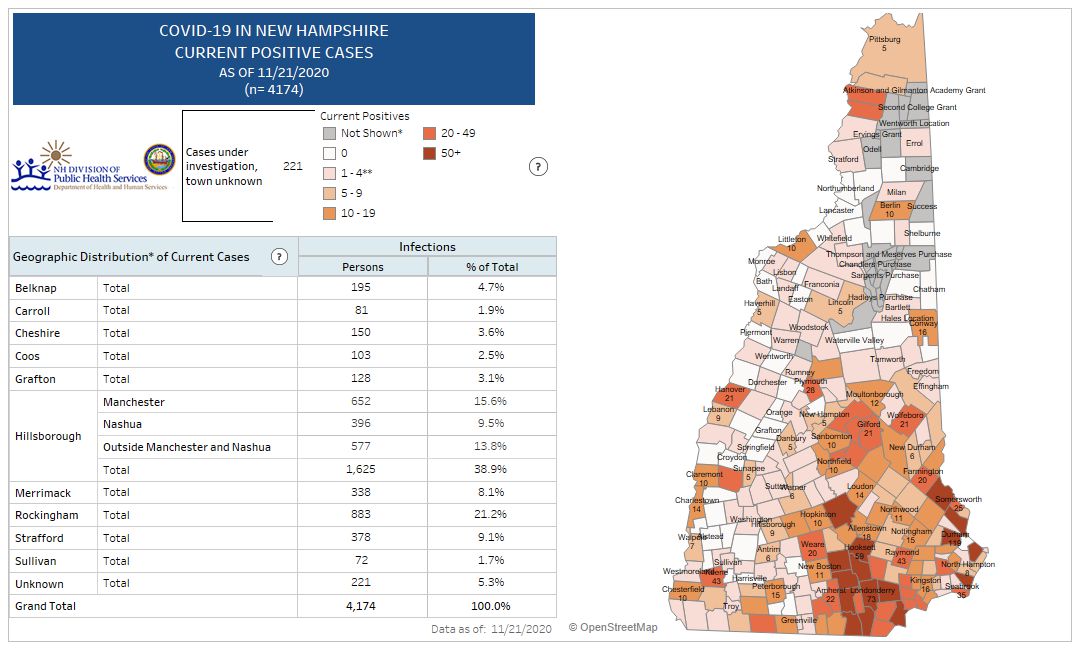 On Saturday, November 21, 2020, DHHS announced 493 new positive test results for COVID-19, for a daily PCR test positivity rate of 2.2%. Today’s results include 339 people who tested positive by PCR test and 154 who tested positive by antigen test. There are now 4,174 current COVID-19 cases diagnosed in New Hampshire.