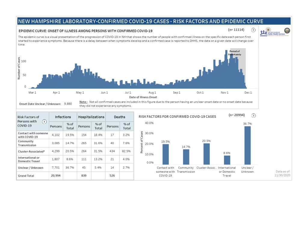 On Monday, November 30, 2020, DHHS announced 514 new positive test results for COVID-19, for a daily PCR test positivity rate of 5.5%. Today’s results include 287 people who tested positive by PCR test and 227 who tested positive by antigen test. There are now 5,145 current COVID-19 cases diagnosed in New Hampshire. Of the results reported today, 265 new positive test results are from Saturday, 11/27 and 249 new positive test results are from Sunday, 11/28. Test results received Sunday are still being processed and the total number of new positives for that day is not yet complete. Updated case counts for prior days will be reflected on the COVID-19 interactive dashboard.