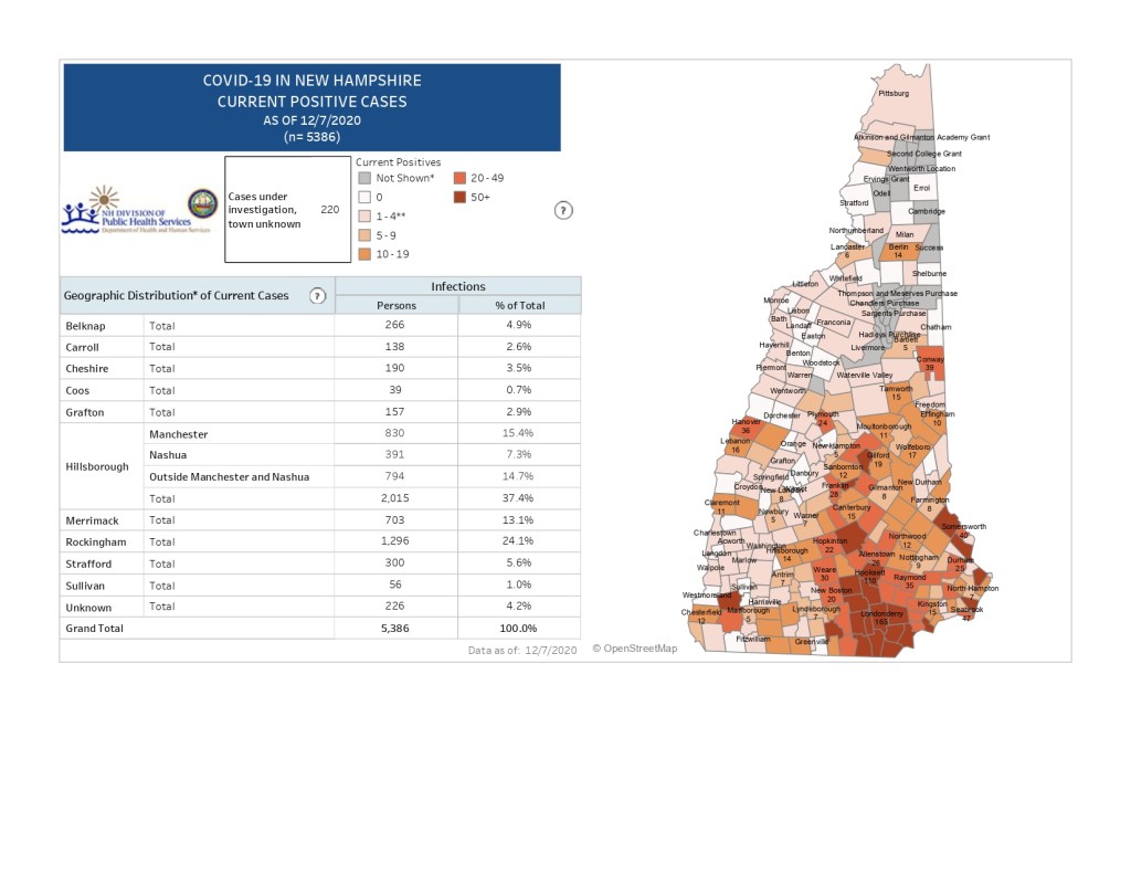 On Monday, December 7, 2020, DHHS announced 1,045 new positive test results for COVID-19, for a daily PCR test positivity rate of 6.8%. Today’s results include 765 people who tested positive by PCR test and 280 who tested positive by antigen test. There are now 5,386 current COVID-19 cases diagnosed in New Hampshire. Of the results reported today, 78 new positive test results are from Wednesday, 12/2 (for a new daily total of 1,157); 244 new positive test results are from Thursday, 12/3 (for a new daily total of 798); 423 new positive test results are from Saturday, 12/5 (for a daily total of 485); and 300 new positive test results are from Sunday, 12/6. Test results for previous days are still being processed and the total number of new positives for those days are not yet complete. Updated case counts for prior days will be reflected on the COVID-19 interactive dashboard.
