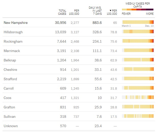 On Sunday, December 13, 2020, DHHS announced 722 new positive test results for COVID-19, for a daily PCR test positivity rate of 5.9%. Today’s results include 490 people who tested positive by PCR test and 232 who tested positive by antigen test. There are now 6,560 current COVID-19 cases diagnosed in New Hampshire. Of the results reported today: