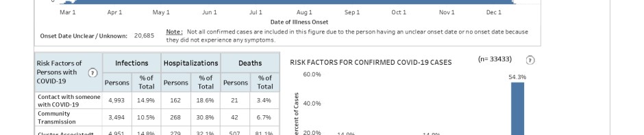 Community-based transmission continues to occur in the State and has been identified in all counties. Of those with complete risk information, most of the cases are either associated with an outbreak setting or have had close contact with a person with a confirmed COVID-19 diagnosis.