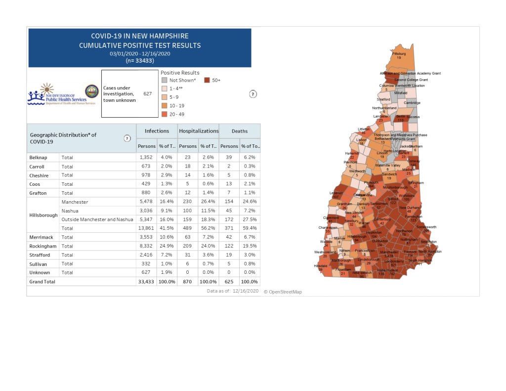 On Wednesday, December 16, 2020, DHHS announced 928 new positive test results for COVID-19, for a daily PCR test positivity rate of 6.4%. Today’s results include 680 people who tested positive by PCR test and 248 who tested positive by antigen test. There are now 6,680 current COVID-19 cases diagnosed in New Hampshire. Of the results reported today: